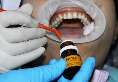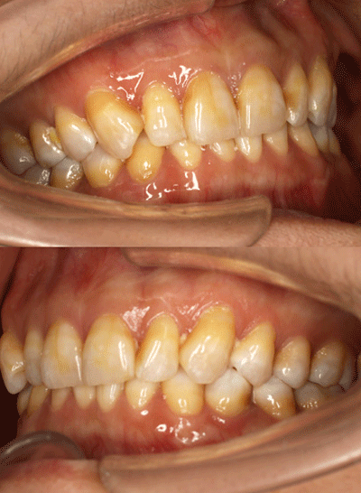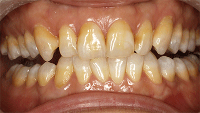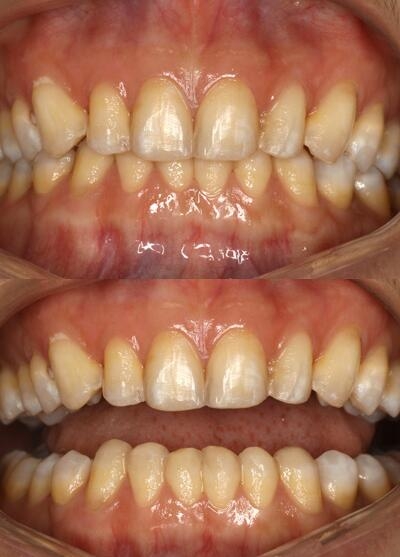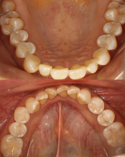 口腔专科检查:全口牙色呈黄褐色斑点状,13-23颊向倾伴生长,12-22舌向内倾,33-43舌向内倾伴磨耗,咬合为深覆颌,牙周良好,微笑时露龈。