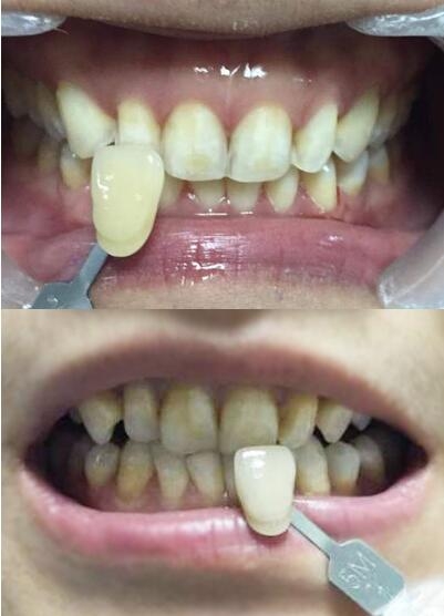 现病史:患者自诉牙齿色泽发黄,要求美观牙齿但不愿大量磨牙,遂来我院寻求少磨牙的治疗方案。
