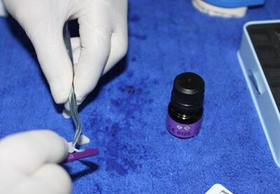 处置:初步沟通治疗方案,取上下颌诊断模型,采集照片及原始影像记录。通过美学分析、设计,结合诊断蜡型,与患者沟通,确定修复方案(患者要求先行11、21牙贴面修复),根据诊断蜡型,制作硅橡胶导板,在此指导下精确、微创预备基牙,排龈、取模、比色、3D打印、生产制作瓷贴面、试戴、选择粘接剂颜色,永久粘接,采集照片及录像。